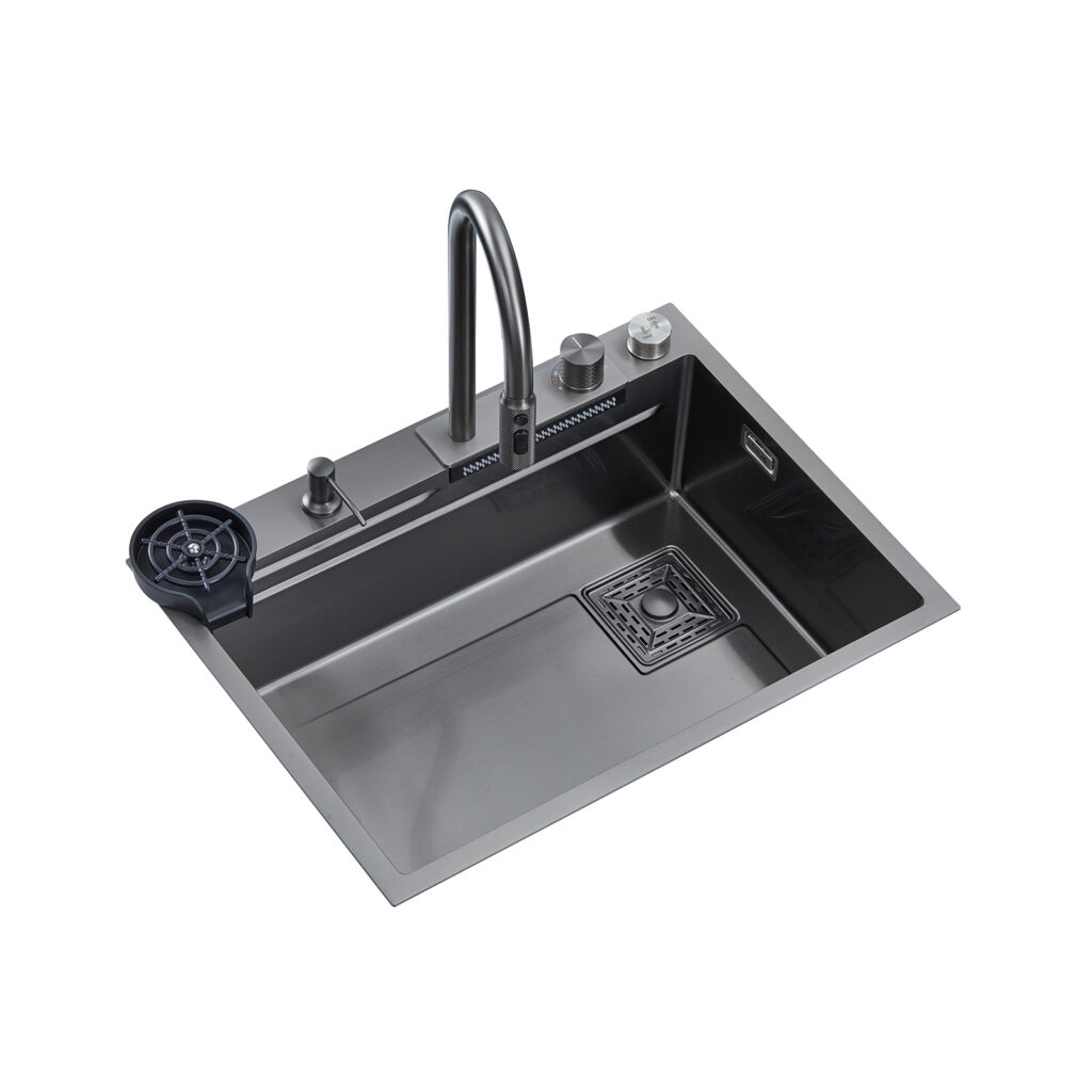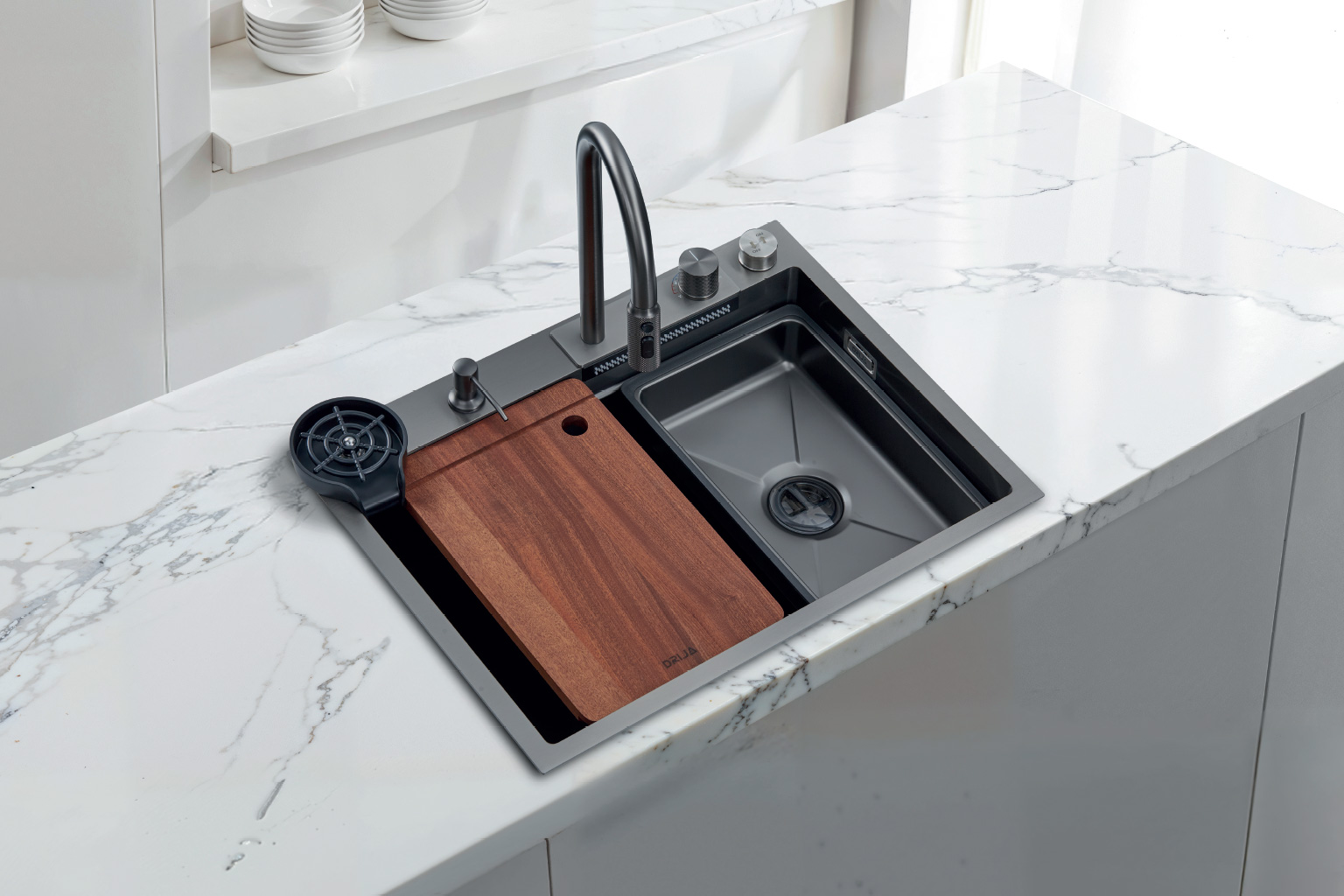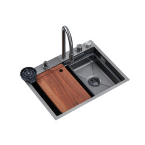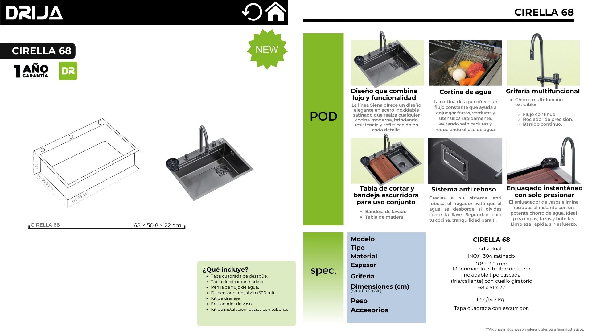 El fregadero CIRELLA 68 está diseñado para cocinas modernas que buscan funcionalidad real sin sacrificar estética. Fabricado en INOX 304 satinado, integra una grifería multifuncional tipo cascada (frío/caliente) con cuello giratorio, cortina de agua para enjuague rápido, enjuagador de vaso a presión y dispensador de jabón de 500 ml para una estación de lavado completa y ordenada. Su sistema anti reboso aporta seguridad en el uso diario, mientras que los accesorios incluidos (tabla y escurridor) te permiten separar tareas y trabajar con más higiene y practicidad.