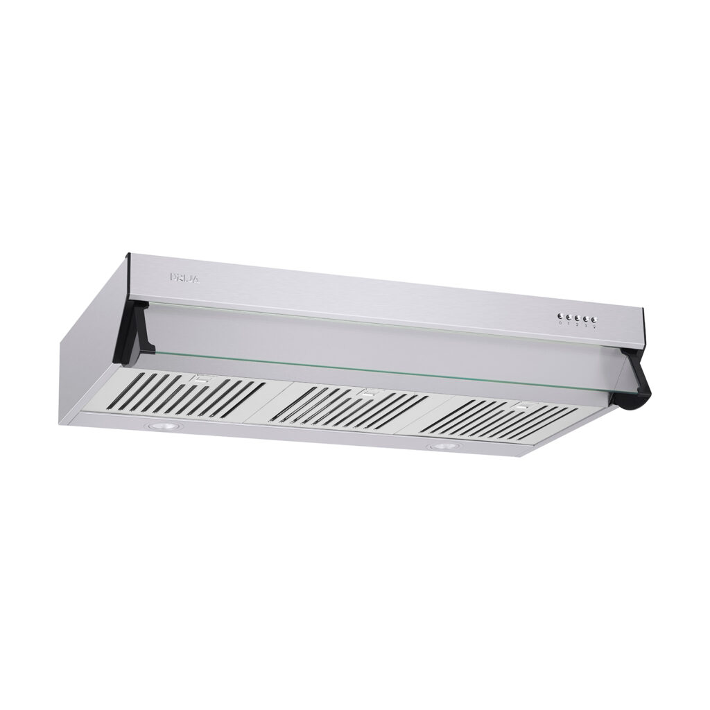 Campana extractora de montaje en pared, con diseño compacto de 90 cm, cuerpo de acero con frente en vidrio. Ofrece alta capacidad de extracción, bajo nivel de ruido y sistema de filtrado doble (carbón activo + acero inoxidable).