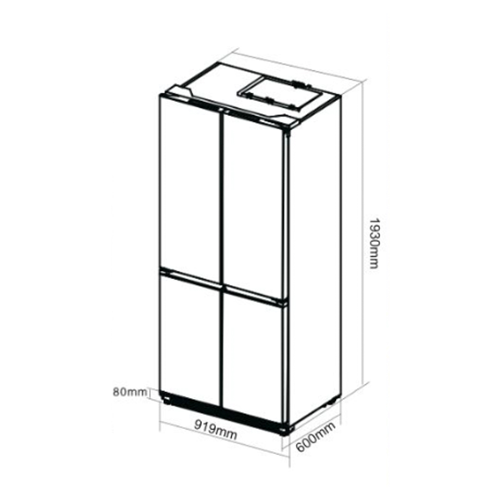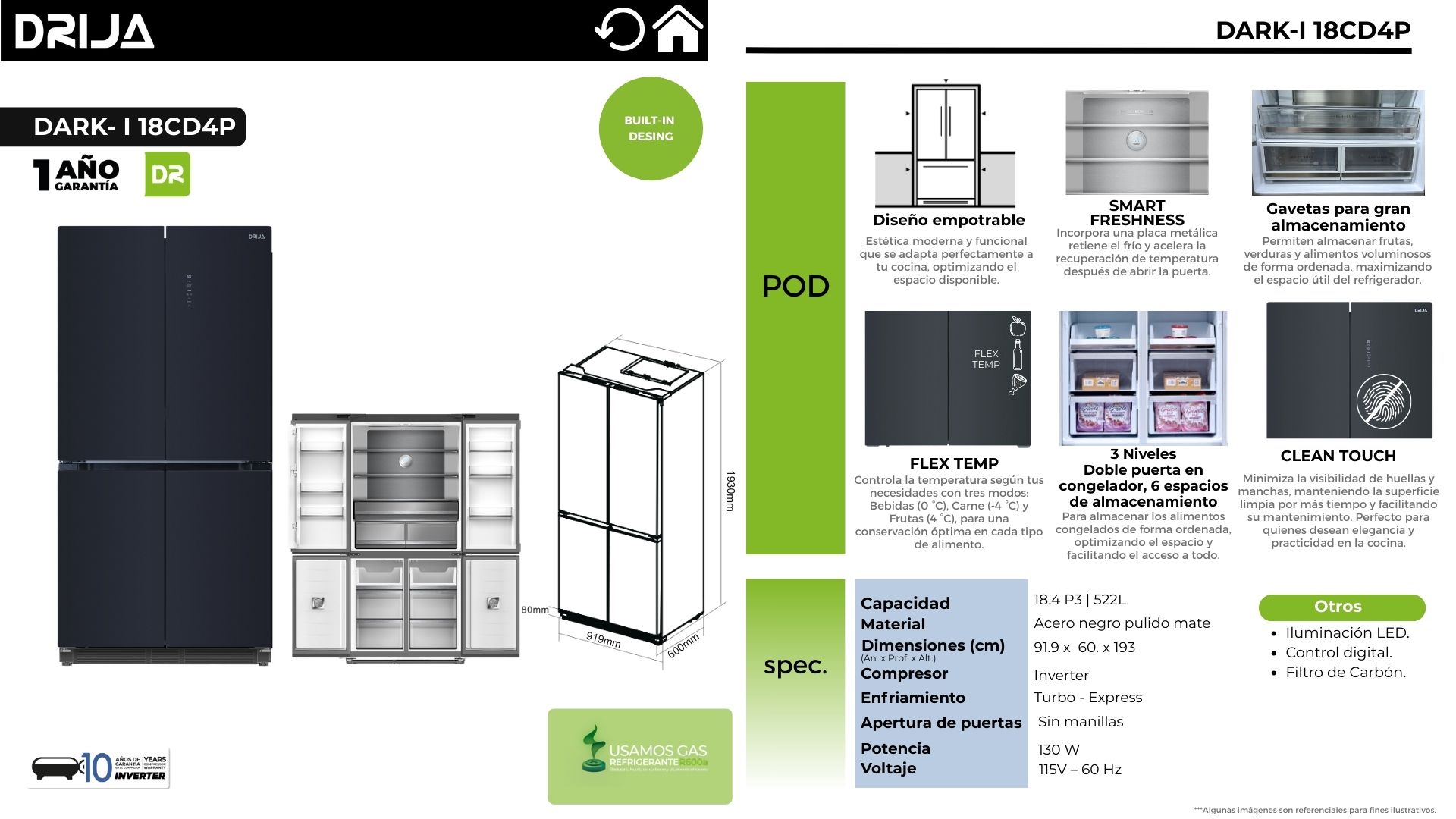 El DARK- I 18CD4P es un refrigerador empotrable de gran capacidad, diseñado para integrarse con una estética moderna y funcional en cocinas contemporáneas. Su acabado en acero negro pulido mate aporta presencia premium y, gracias a la tecnología Clean Touch, ayuda a minimizar la visibilidad de huellas para mantener el frente más limpio por más tiempo.