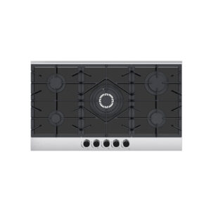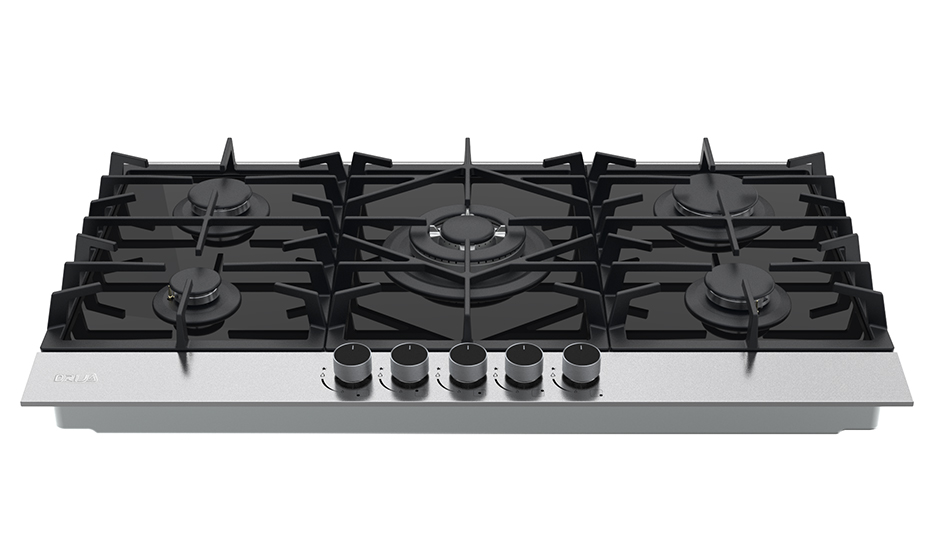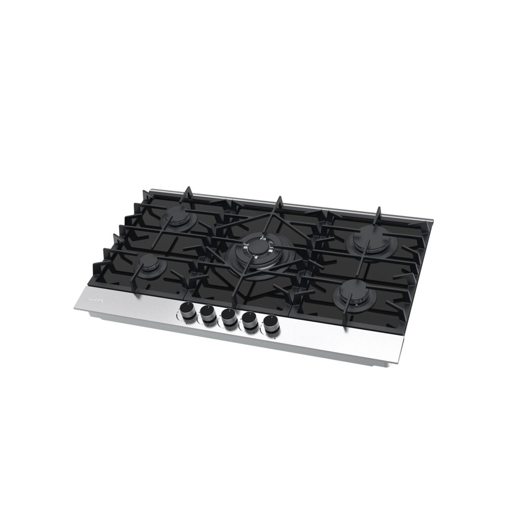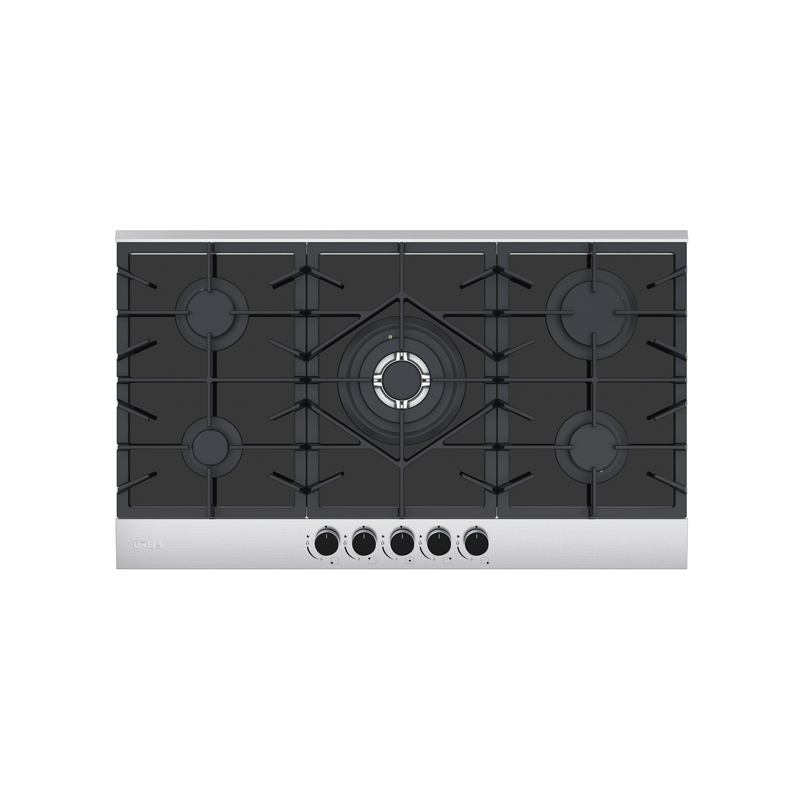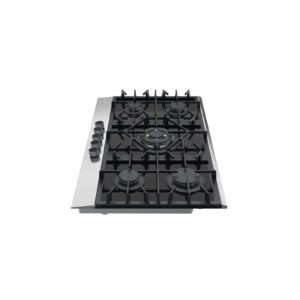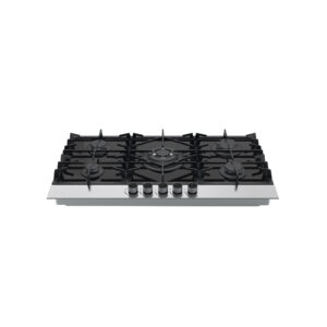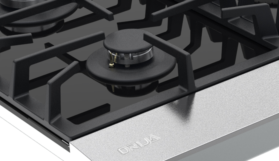 Elegante superficie en acero inoxidable cepillado que facilita la limpieza, acompañada de parrillas de hierro colado negro mate que dan un acabado profesional.
