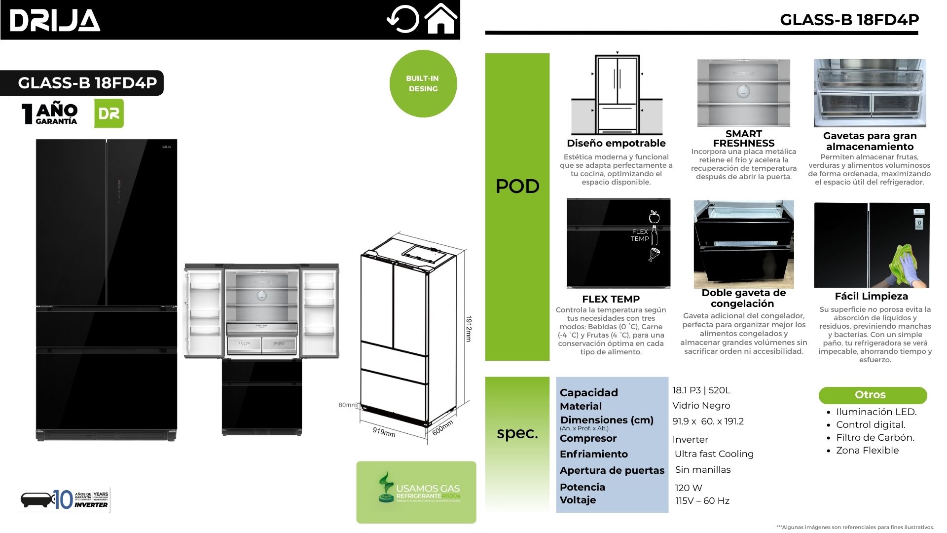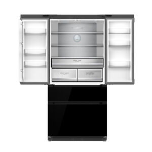El refrigerador GLASS-B 18FD4P combina un diseño empotrable con acabado en vidrio negro para lograr una instalación limpia y elegante en cocinas modernas y minimalistas. Integra compresor Inverter para un funcionamiento más estable y eficiente, y un sistema Ultra Fast Cooling que acelera el enfriamiento para conservar mejor bebidas y alimentos. Su distribución interna prioriza el orden con gavetas de gran almacenamiento y una doble gaveta de congelación, ideal para clasificar congelados sin sacrificar acceso. Además, su superficie facilita la limpieza diaria, manteniendo el equipo impecable por más tiempo.