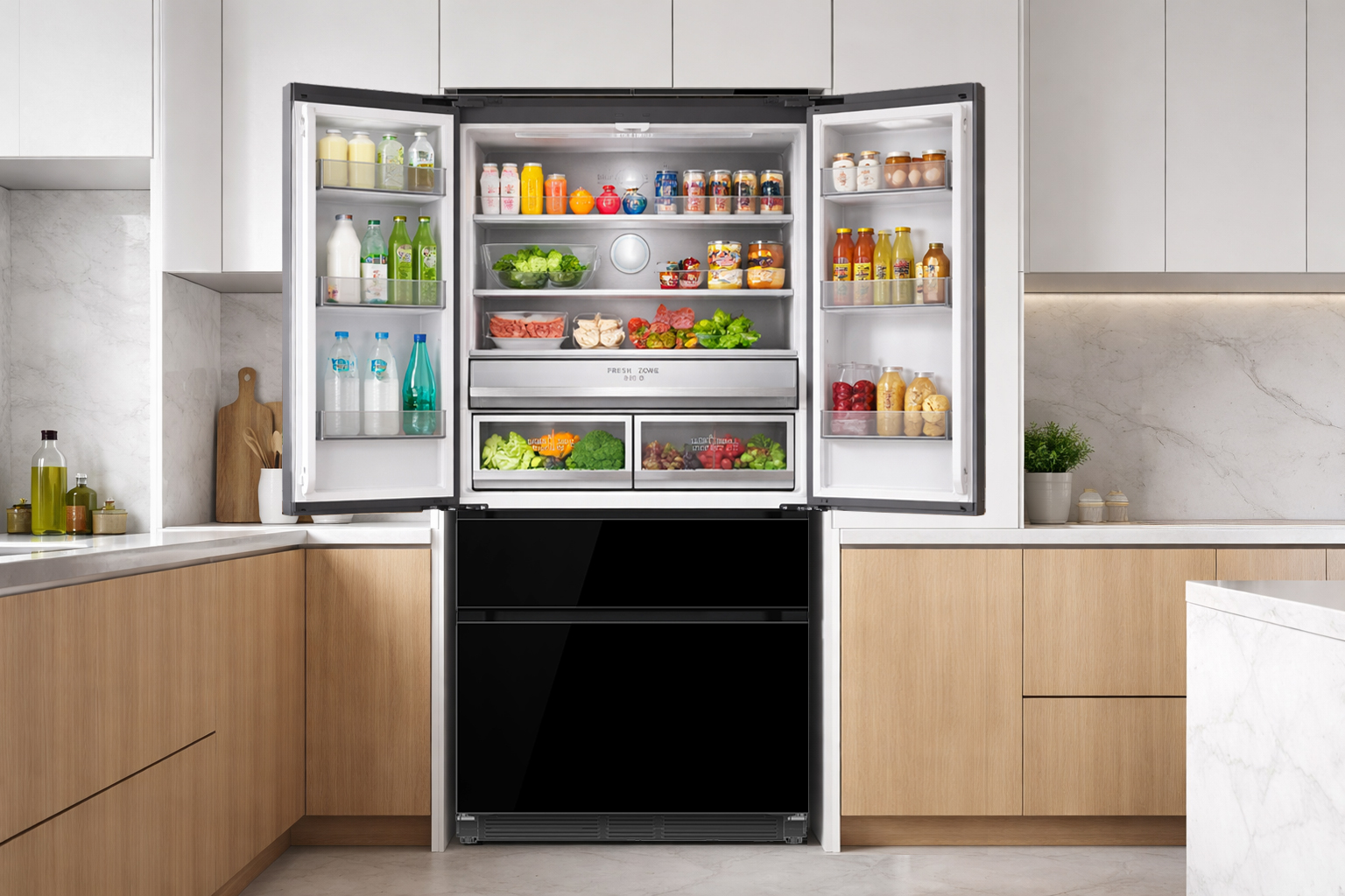 Las gavetas de gran capacidad permiten almacenar frutas, verduras y alimentos voluminosos de forma ordenada, maximizando el espacio útil del refrigerador.