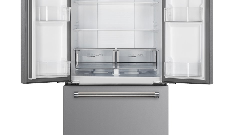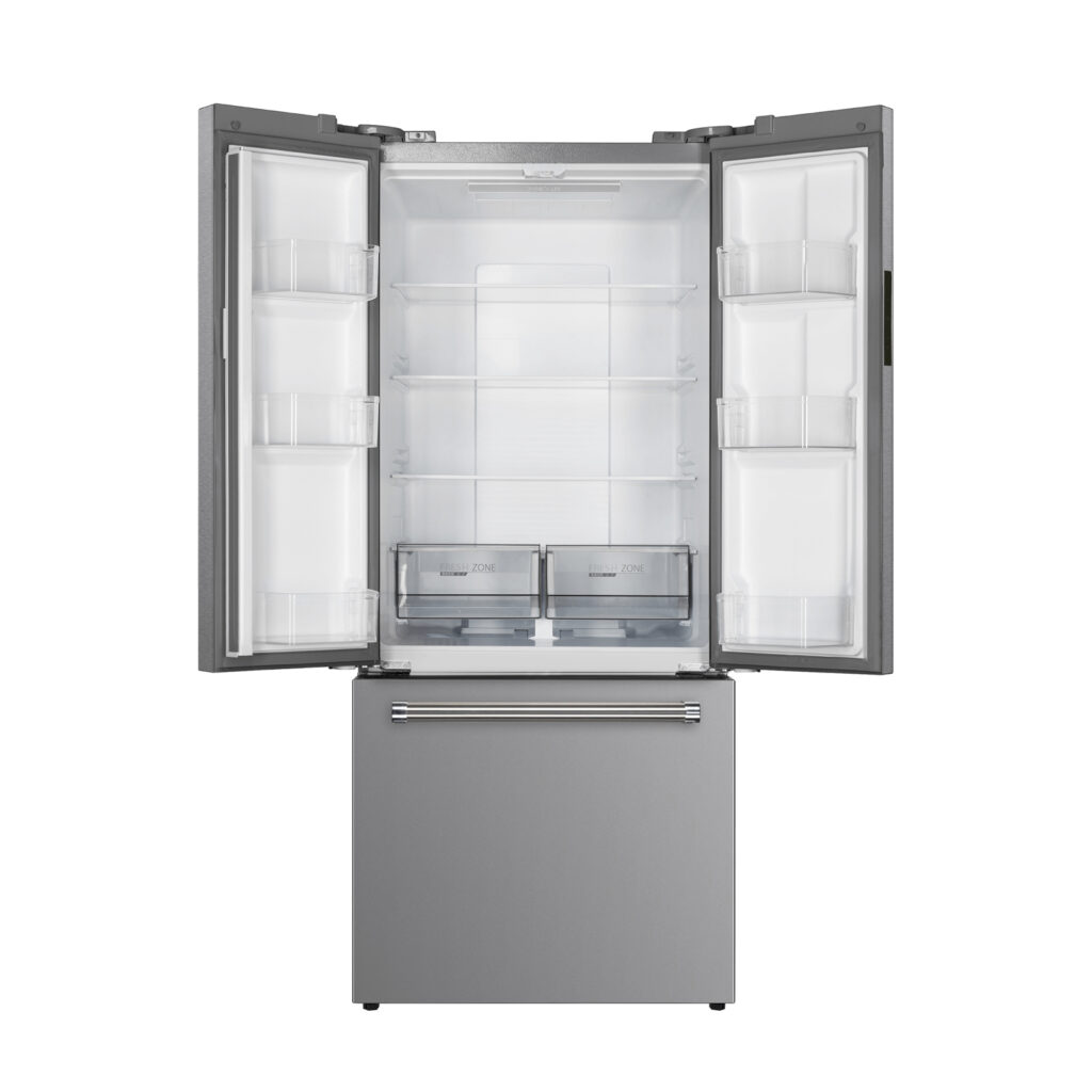 El refrigerador INOX-18D3P de DRIJA combina un diseño moderno en acero inoxidable con puertas tipo French Door y capacidad de 18 P³ / 509 L. Ofrece multi zona de enfriamiento y Ultra Fast Cooling para mantener los alimentos frescos por más tiempo. Incluye bandejas de vidrio templado, bandeja de congelador ajustable, iluminación LED y filtro de carbón para preservar la frescura. Su superficie es fácil de limpiar y su apertura con manijas ofrece un agarre ergonómico.