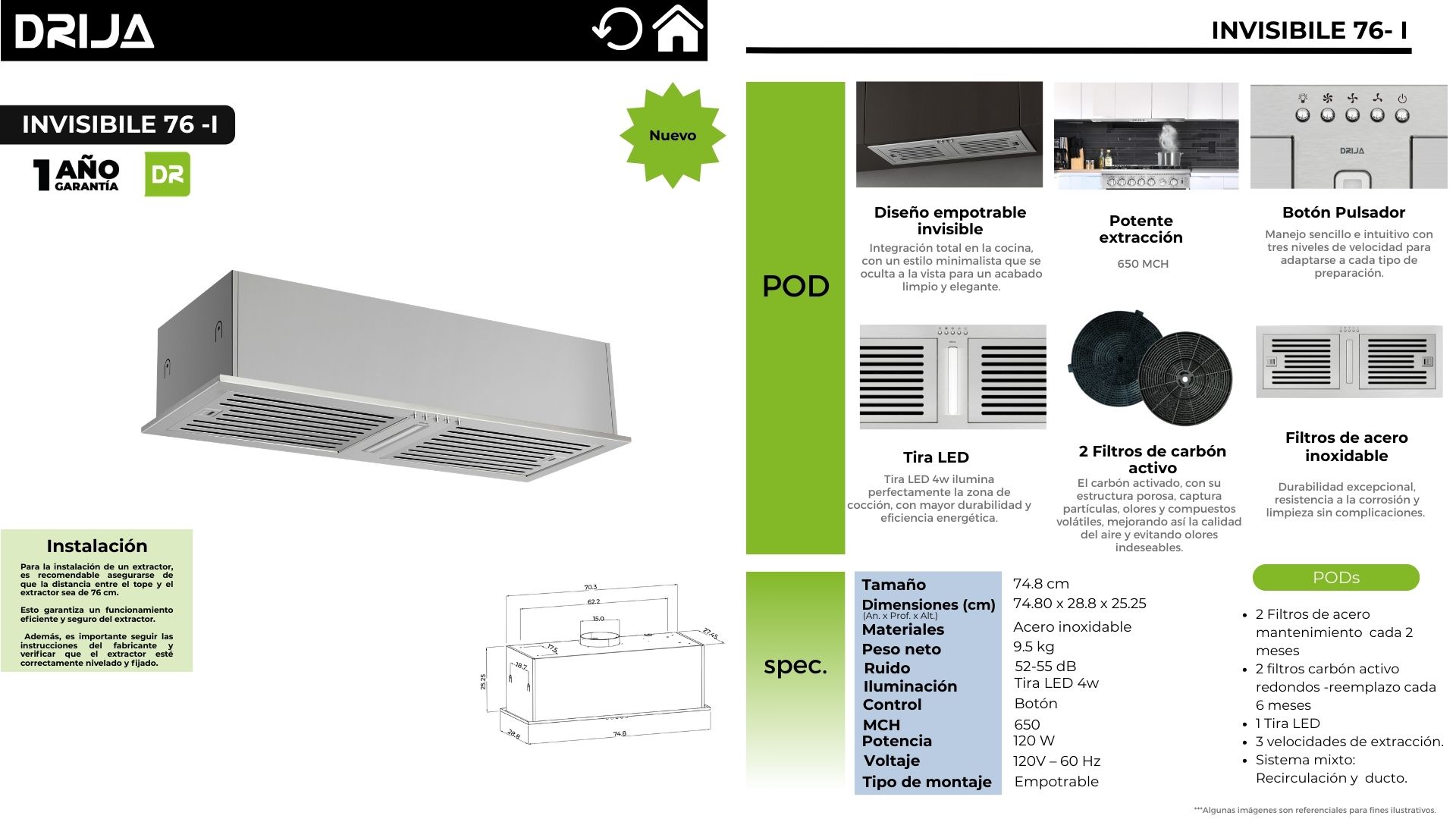 El extractor empotrable invisible INVISIBLE 76 – I se integra totalmente en la cocina para un acabado limpio y minimalista, manteniendo el área de cocción libre de humo y olores con potencia de extracción 650 MCH. Incorpora botón pulsador con 3 velocidades, tira LED 4W para iluminar la zona de cocción y un sistema de filtración eficiente con filtros de acero inoxidable y 2 filtros de carbón activo para modo recirculante y ducto. Ideal para cocinas modernas que buscan estética discreta, funcionalidad y aire más limpio.
