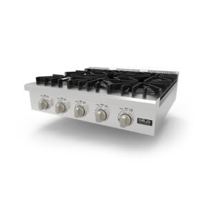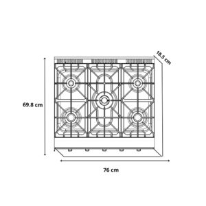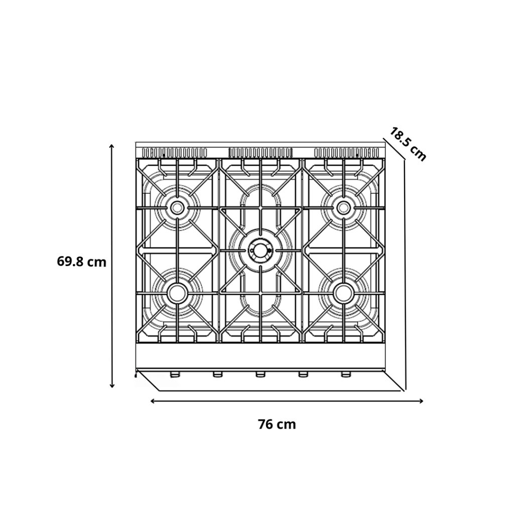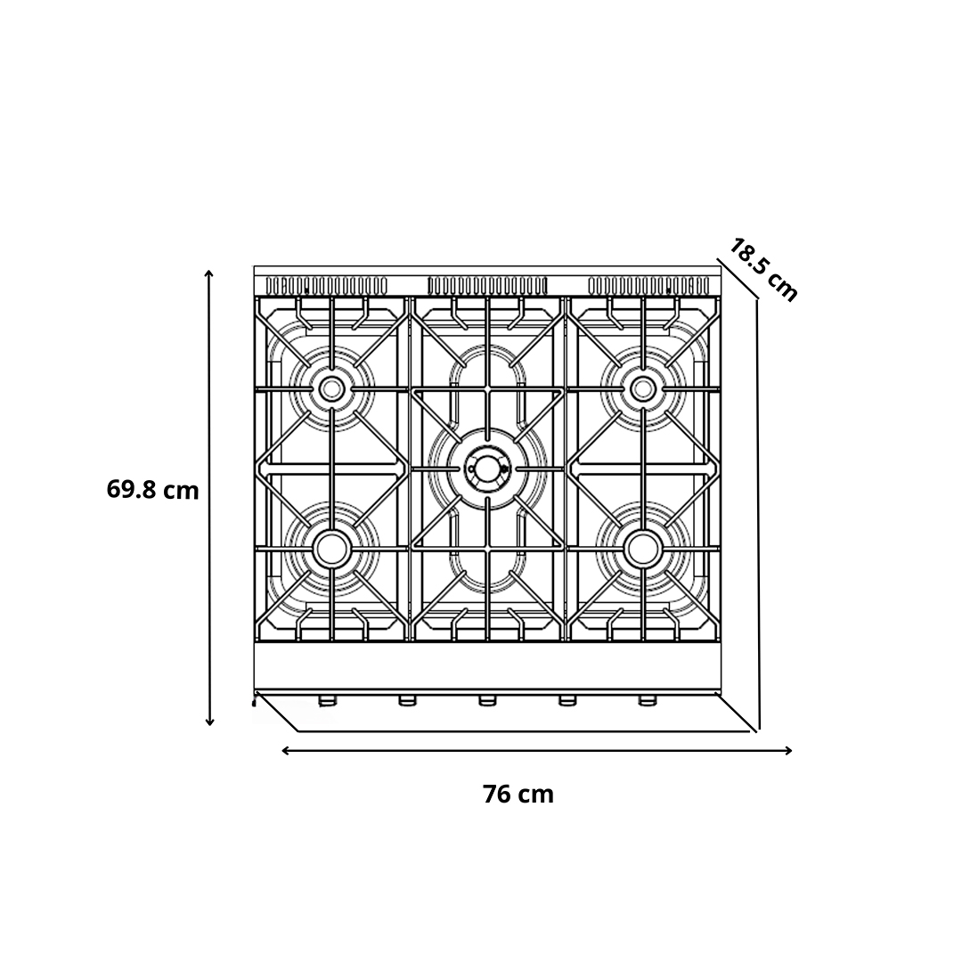 Estufa semi-profesional de 76 cm con diseño robusto en acero inoxidable y parrillas de hierro colado. Incorpora cinco potentes quemadores DEFENDI con válvulas de seguridad, plancha de hierro, perillas metálicas de alto desempeño y encendido eléctrico.