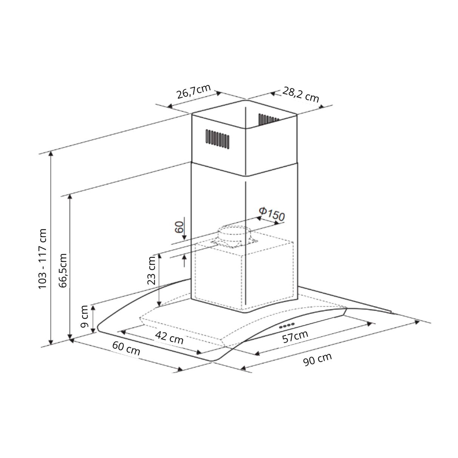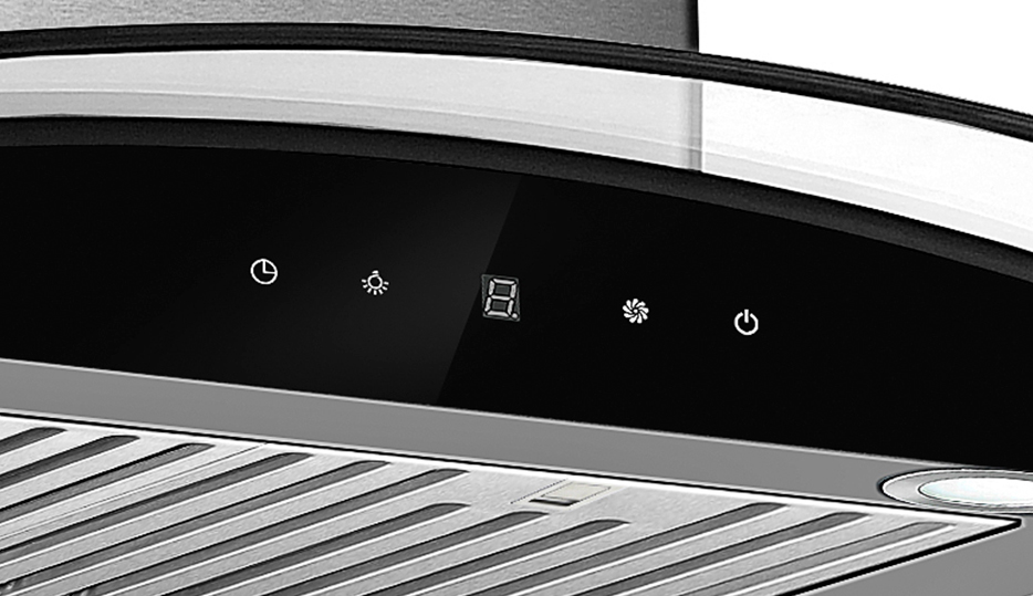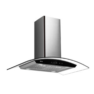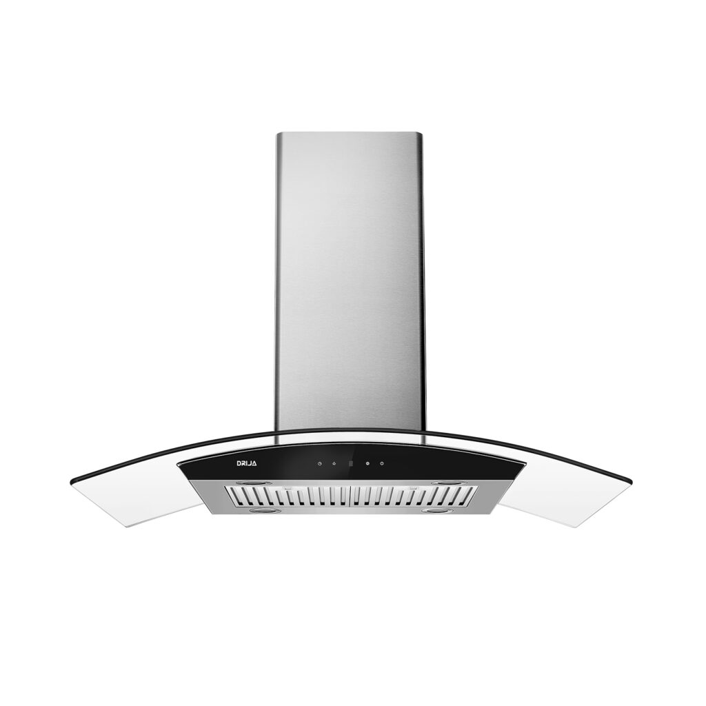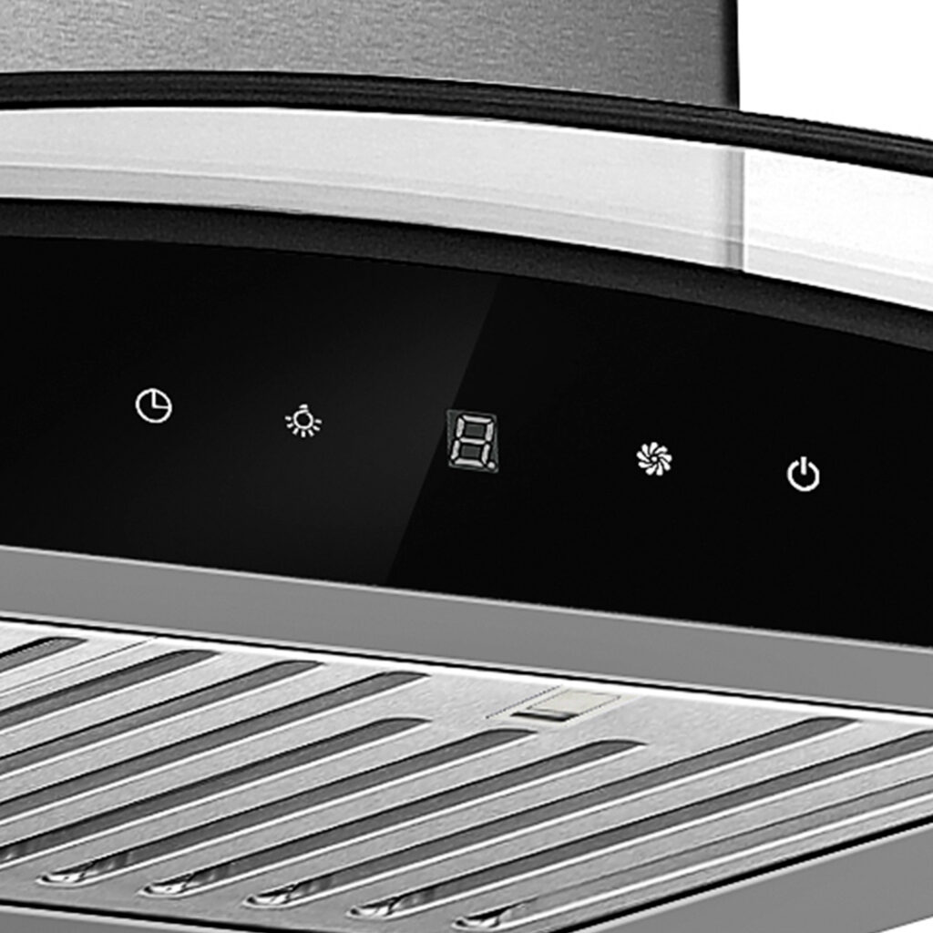 Campana extractora tipo isla de 90 cm con diseño elegante y curvo. Equipada con panel digital, filtro de carbón, sistema de filtración múltiple y 4 luces LED. Ideal para espacios abiertos, con extracción potente y silenciosa.