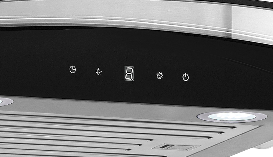Campana decorativa de 76 cm con diseño curvo en acero y vidrio templado. Equipada con panel digital, triple filtración y alta eficiencia de extracción, ideal para cocinas modernas y funcionales.