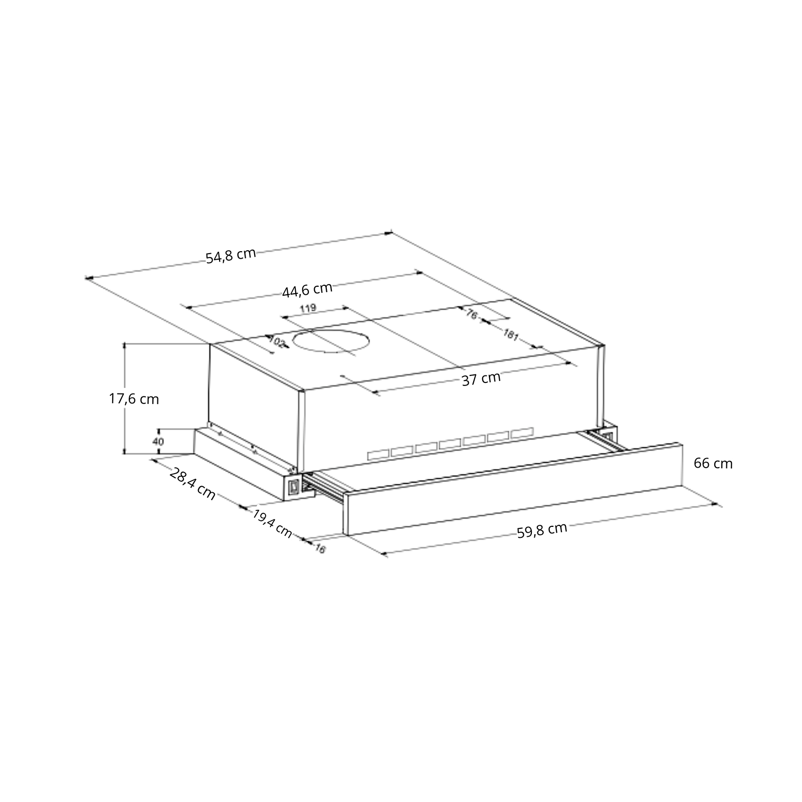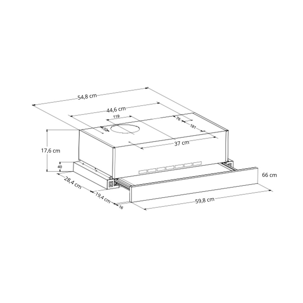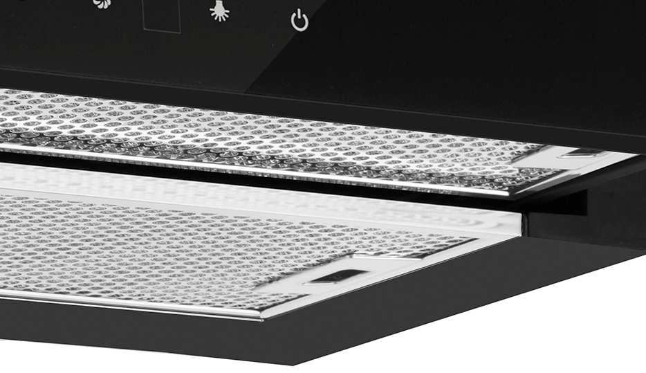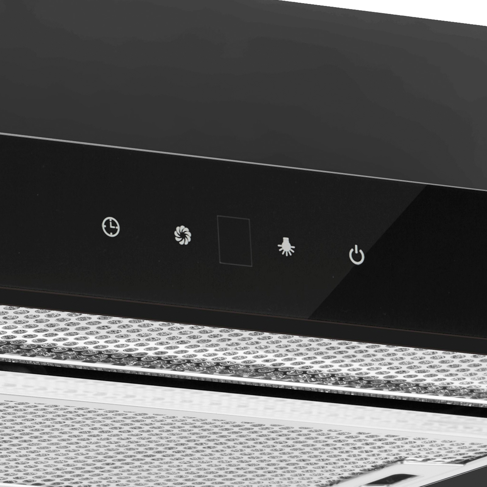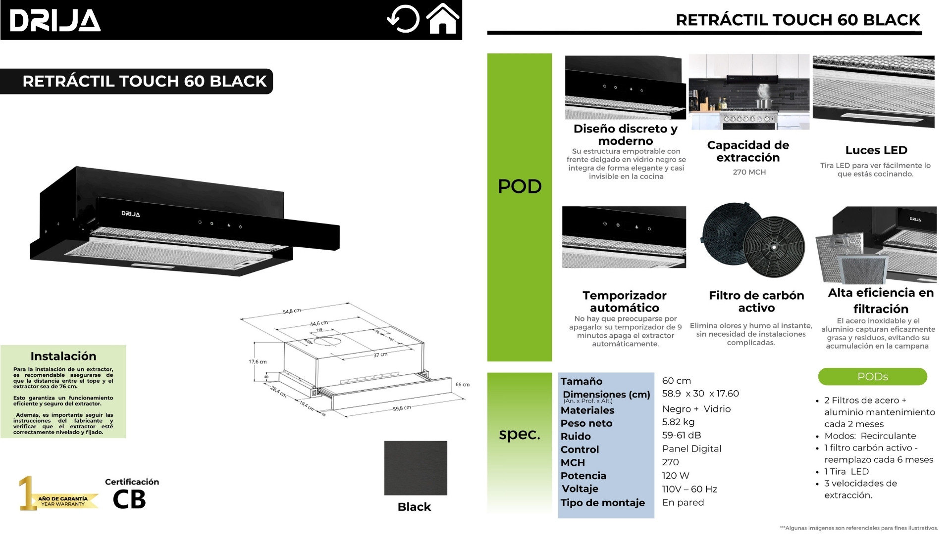 Campana retráctil de 60 cm con panel digital táctil y temporizador automático. Cuenta con línea LED, sistema de filtrado en acero + aluminio, filtro de carbón activo y diseño eficiente para instalaciones discretas.