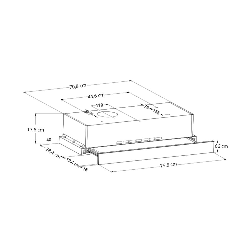 Campana retráctil de 76 cm con panel digital táctil y temporizador automático. Cuenta con línea LED, sistema de filtrado en acero + aluminio, filtro de carbón activo y diseño eficiente para instalaciones discretas.