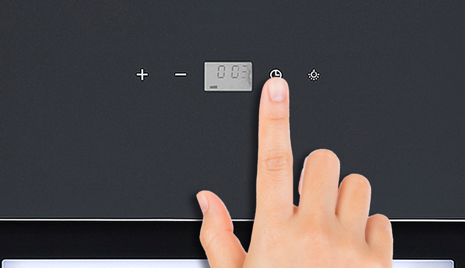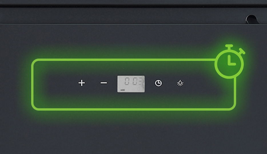 Permite visualizar la hora y programar el tiempo de funcionamiento del extractor hasta 1 hora.