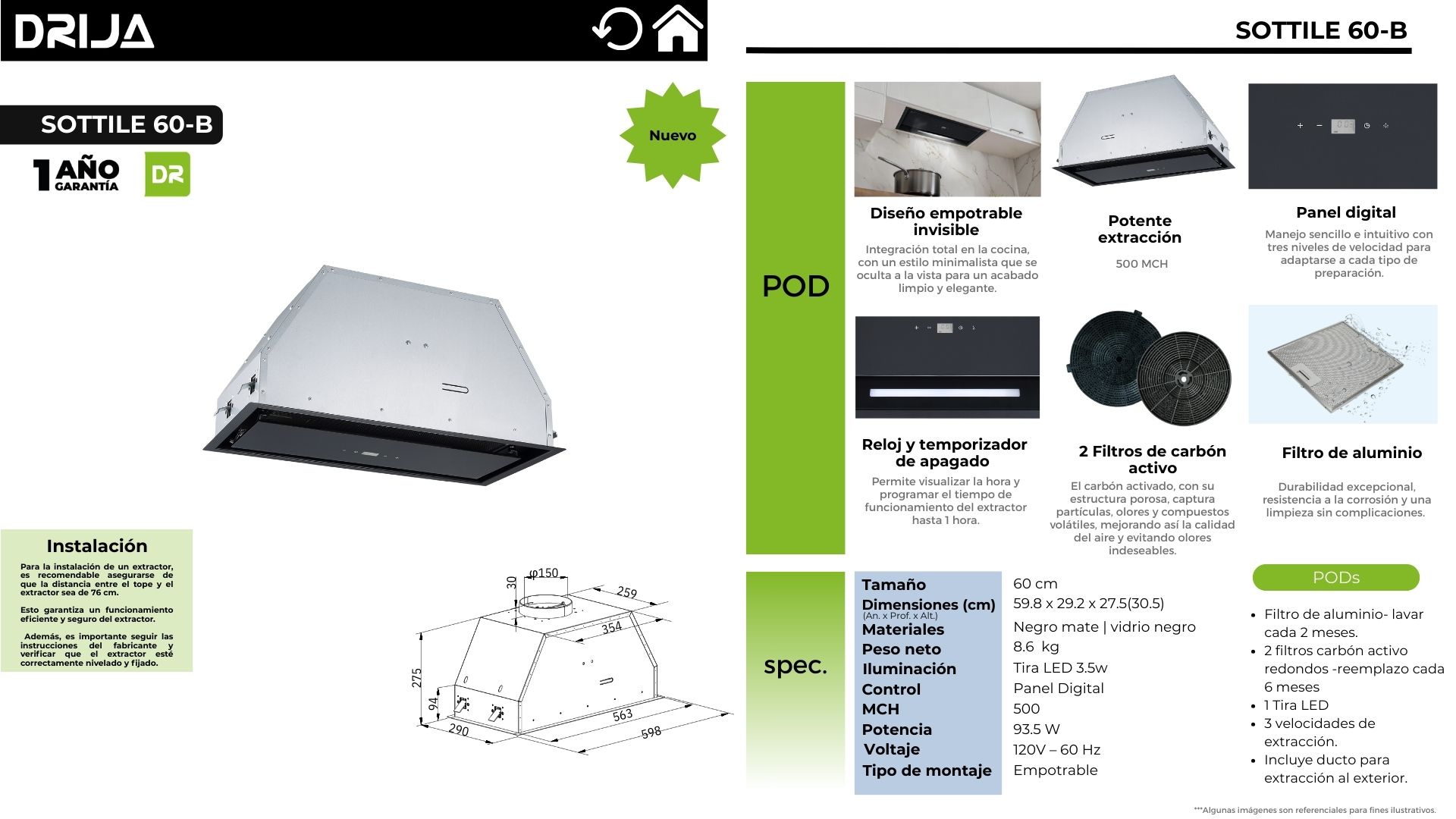 El extractor SOTTILE 60- B ofrece una solución empotrable e invisible para cocinas modernas, logrando una integración limpia y minimalista dentro del mueble. Su potente extracción de 500 MCH ayuda a reducir humo y olores durante la cocción, mientras el panel digital permite un control claro y sencillo con tres velocidades. Incorpora tira LED para mejorar la visibilidad sobre la zona de cocción, además de filtro de aluminio lavable y 2 filtros de carbón activo.
