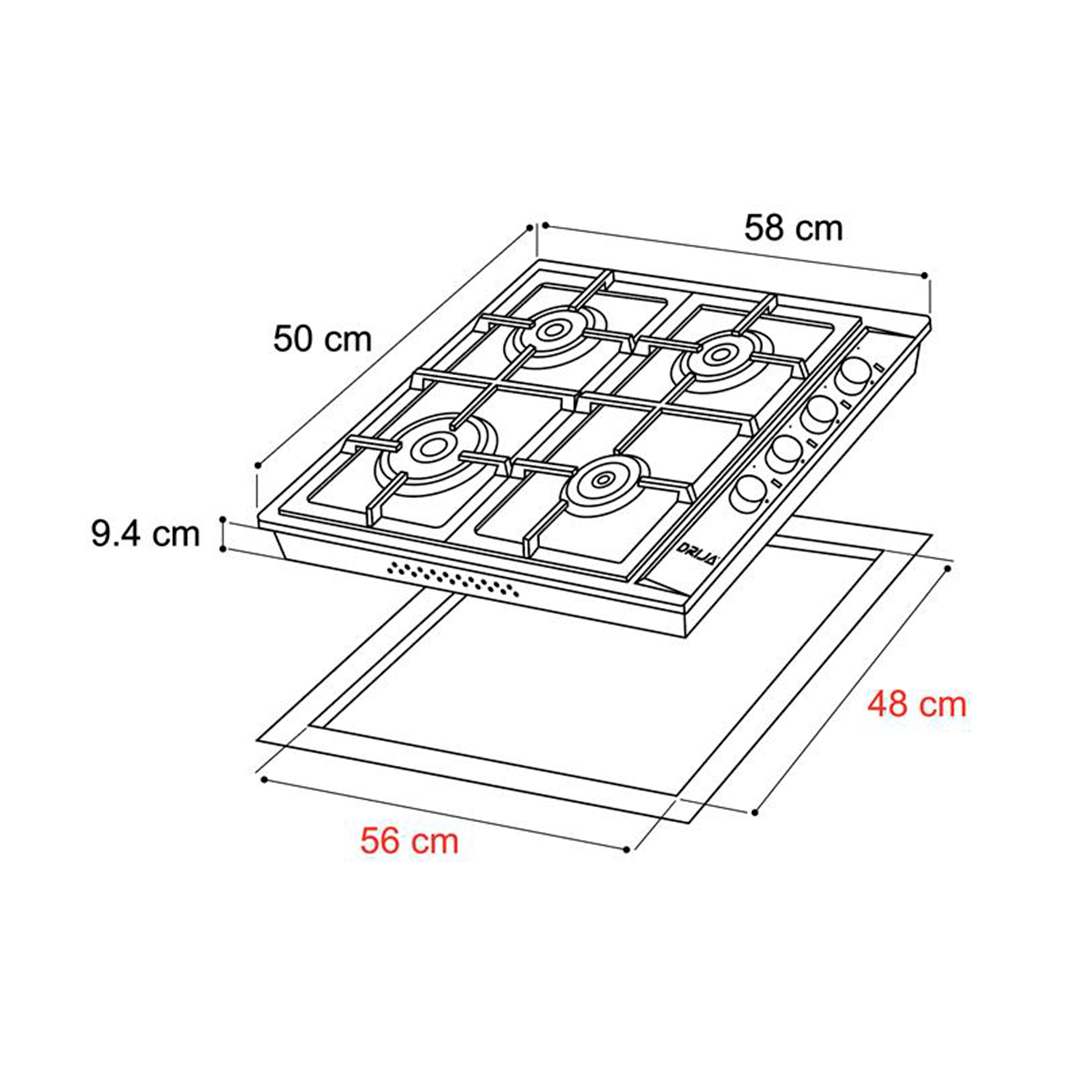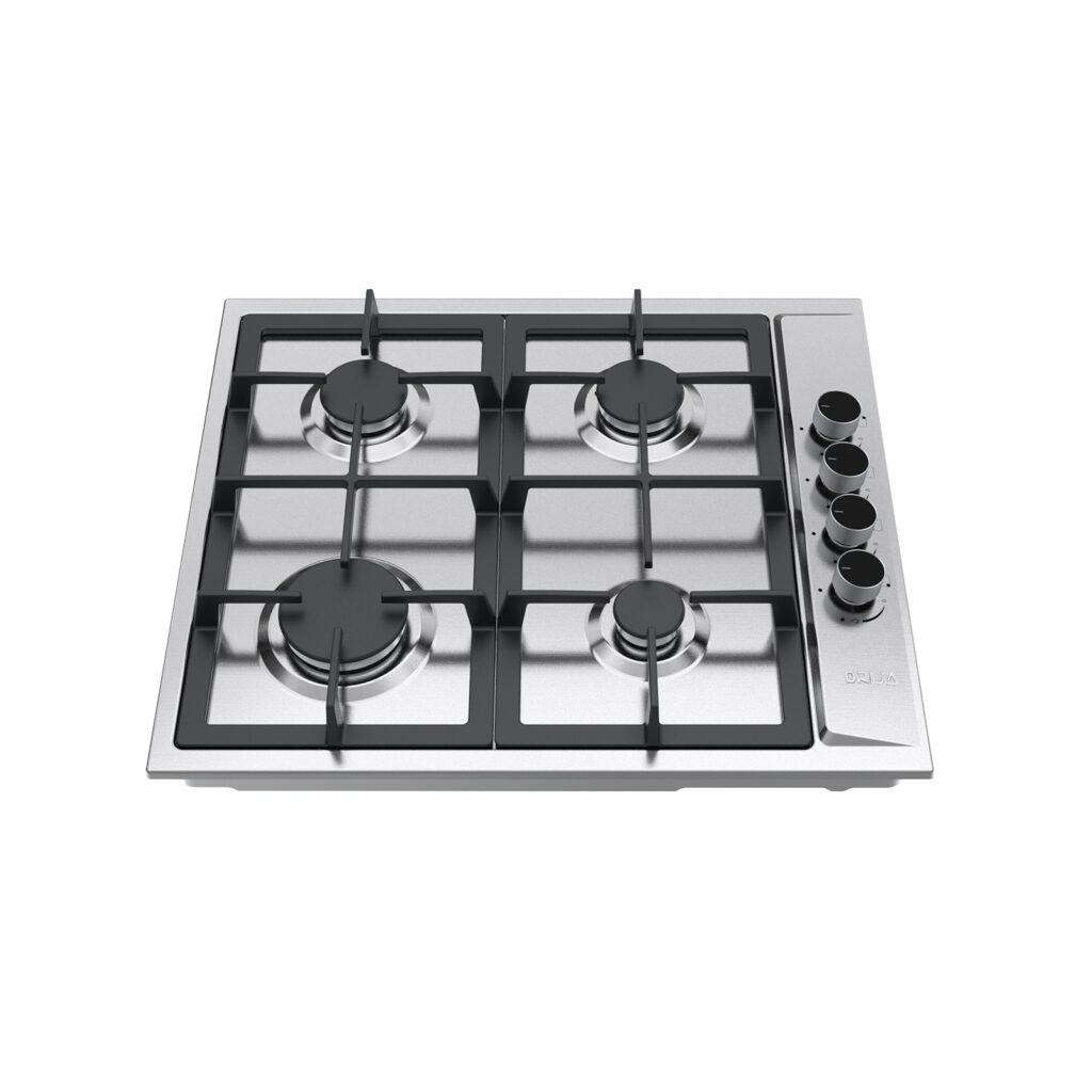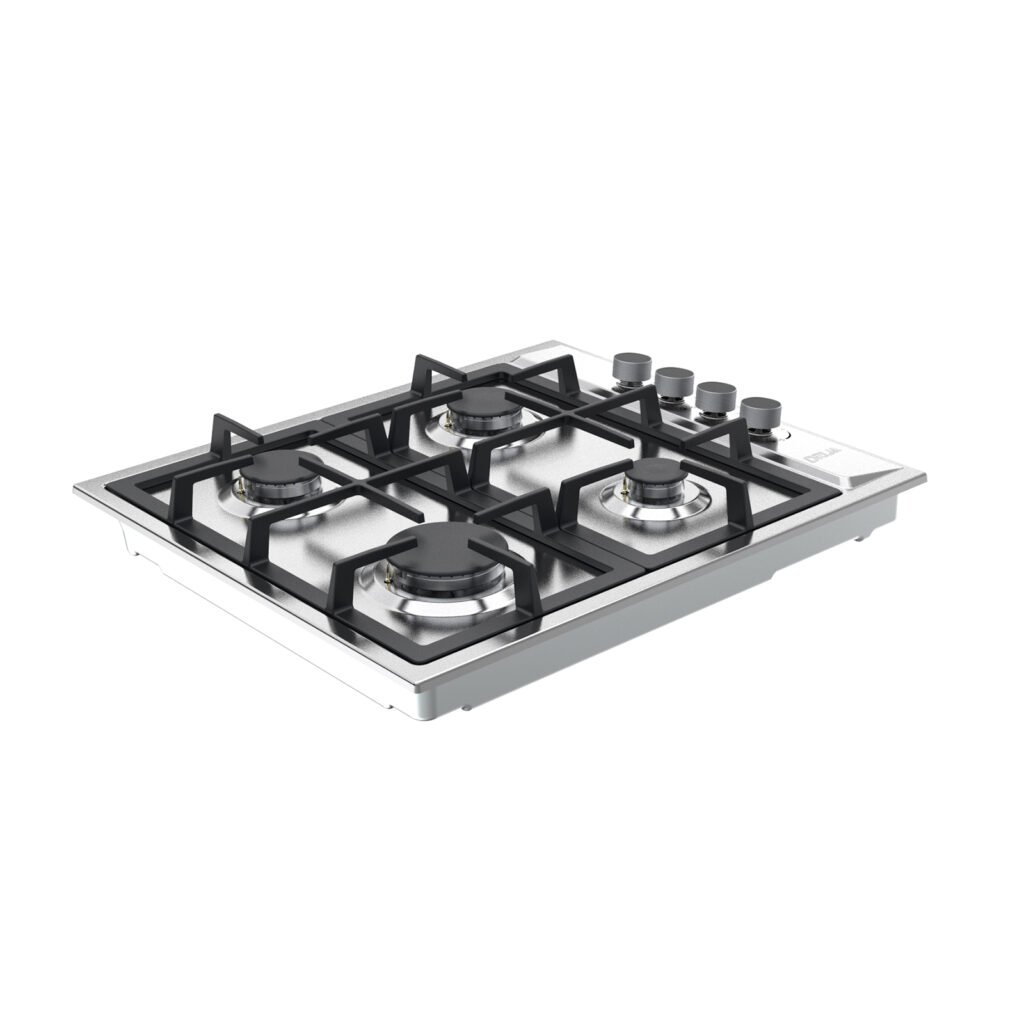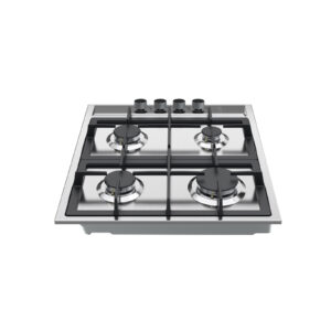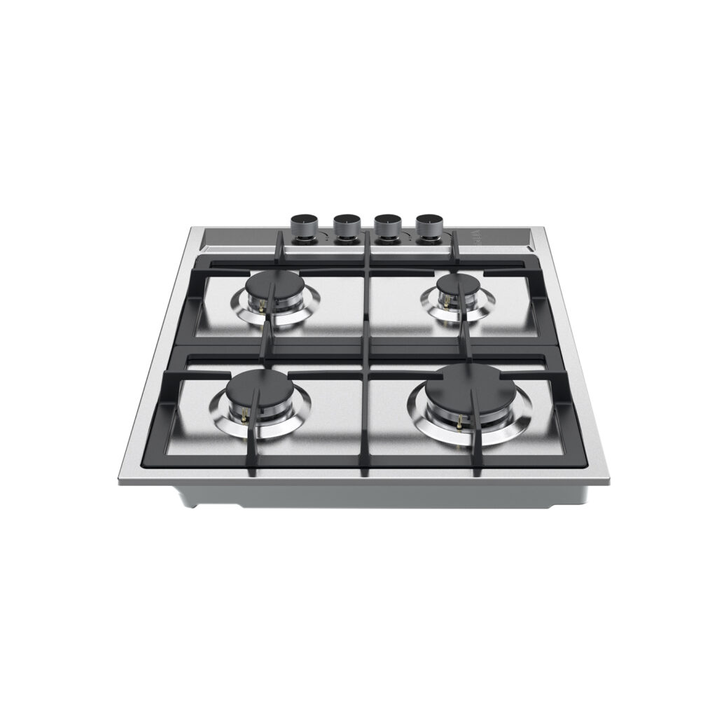 Estufa empotrable de 60 cm con cubierta en acero inoxidable y parrillas de hierro colado. Ofrece 4 quemadores de diferentes intensidades, sistema de válvulas de seguridad y diseño compacto ideal para cocinas funcionales y modernas.